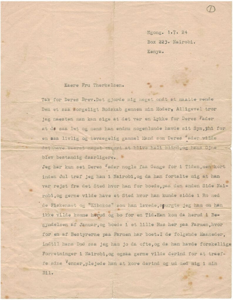 Efter Peter Aarups død i april 1924 beder Karen Blixen i et brev til sin mor, Ingeborg Dinesen, om at denne skriver til hans datter mhp. at orientere om faren Peter Aarups død. Det gør Ingeborg Dinesen, der videreformidler Karen Blixens adresse i Kenya. Datteren får nyheden overbragt og skriver til Karen Blixen i Kenya, at farens bortgang berørte hende meget. Det er på denne baggrund, at Karen Blixen skriver brevet nedenfor til Anna Elisabeth Therkelsen.